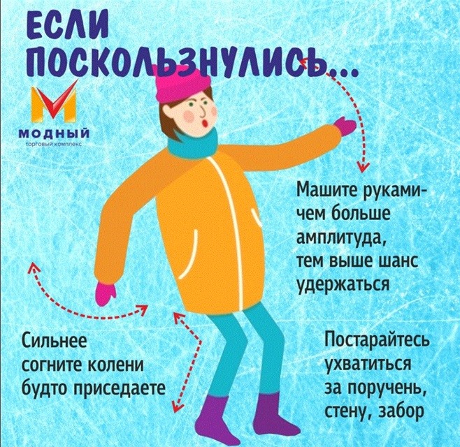 Если вы поскользнулись, присядьте, чтобы снизить высоту падения. Распространенным заблуждением является рекомендация расслабиться при падении. Шанс заработать перелом в расслабленном состоянии возрастает, потому что сила удара приходится на кости. В момент падения, наоборот, нужно сгруппироваться. Голову рекомендуется втянуть в плечи, локти прижать к бокам, ноги слегка согнуть. Лучше всего падать на бок. Ни в коем случае нельзя приземлятся на вытянутые руки. Многие так поступают автоматически и в результате - частая гололедная травма - перелом предплечья.